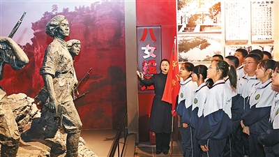 东北抗联史实陈列馆,2007年建成并对外开放,已经接待各界观众超过600万人次。与陈列馆相距不足百米,就是辽宁省本溪市本溪满族自治县的抗联中学。这座以“抗联”命名的中学,每年都要进行抗联精神的教育并组织学生到陈列馆进行现场教学。今年清明节前,抗联中学师生来到陈列馆,向抗联英烈敬献花篮,缅怀抗战往事。图为抗联中学学生在东北抗联史实陈列馆听讲解员讲述八女投江的故事。新华社记者 李 钢摄