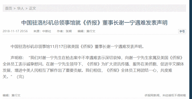 次日凌晨00:03,侨报网正式讣告:美国《侨报》董事长、美国格律文化传媒集团总裁谢一宁先生,于2018年11月16日上午在洛杉矶总部办公室不幸遇害身亡,享年58岁。