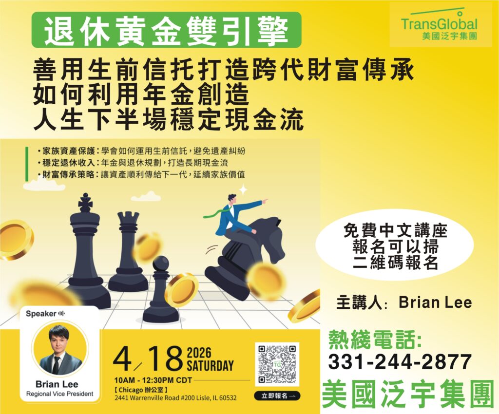 【神州时报讯】随着全球经济环境的波动,如何确保退休生活的经济保障,并实现家族财富的顺利传承,已成为许多家庭关注的核心课题。为了帮助广大华人同胞构建稳健的财务蓝图,美国泛宇集团 (TransGlobal)将于 **2026年4月18日(周六) 在其芝加哥办公室举办一场专题为“退休黄金双引擎”的免费中文理财讲座。