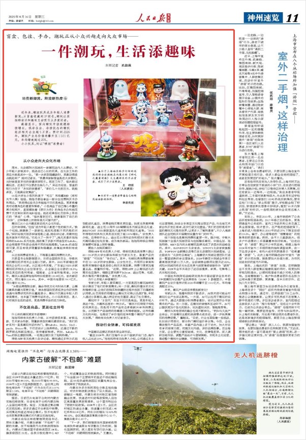 潮玩与其他领域的融合也将不断深化。“例如与文旅产业结合,打造潮玩主题的旅游景点或活动,进一步拓展潮玩的消费场景。”董超说。“目前,行业也面临着一些挑战,比如设计同质化、部分热门潮玩溢价争议等。今后,企业需在提升产品品质、丰富产品内涵上多下功夫,加大对自有IP的培育力度,挖掘文化内涵,讲好品牌故事。在出海方面,企业要充分重视地域、文化、法律等差异,深入调研当地市场,调整产品设计与营销策略,实现本土化运营,推动整个潮玩行业健康、可持续发展。”(本报记者 孔德晨)