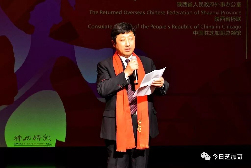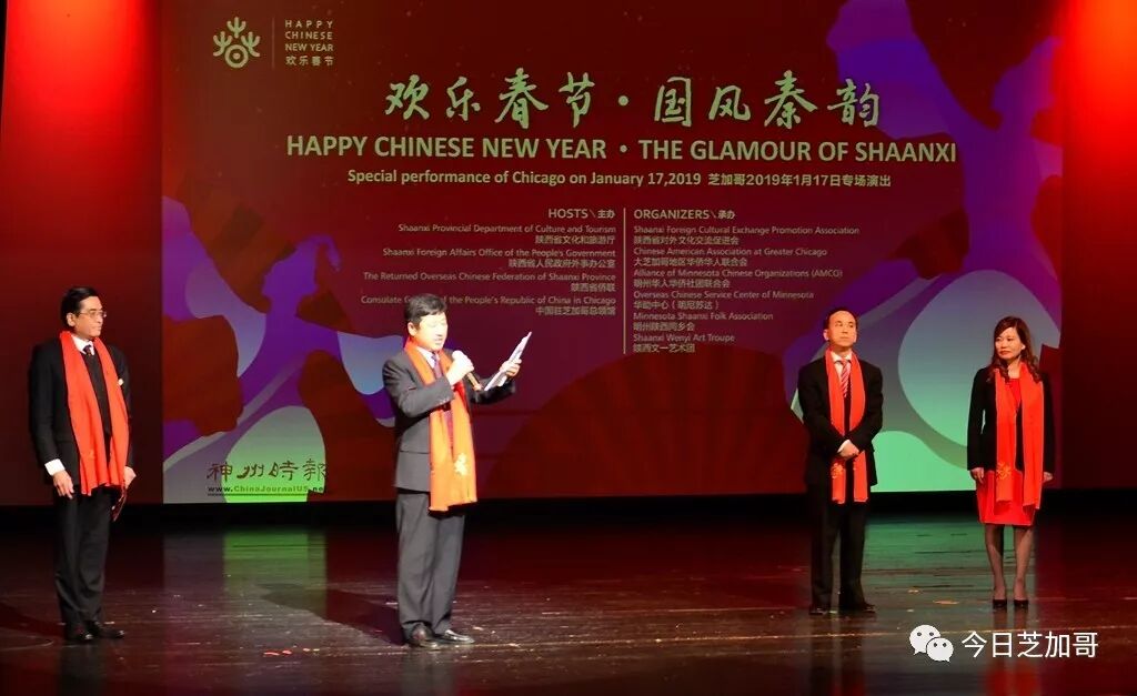 在演出开始之前,本次陕西演出团团长、中国驻芝加哥总领馆刘军代总领事、大芝加哥华侨华人联合会主席郑征分别向在场的观众送上新年的祝福并致辞。