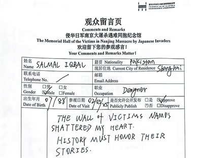 巴基斯坦游客SALMAL IQBAL在参观侵华日军南京大屠杀遇难同胞纪念馆后写下留言:“镌刻满遇难者名字的名单墙令我心碎。历史必须记住他们的遭遇。”资料图片