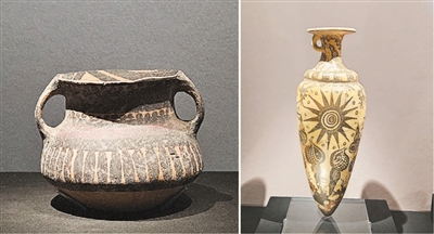 彩陶在中国和希腊拥有彼此独立的文化基础,呈现出既有共性又具差异的的艺术风貌。马家窑彩陶的黑红彩宽带纹样,与米诺斯彩陶的自然主义图案相呼应,二者分别折射出农耕文明与海洋文明对自然景观的抽象表达与直观描绘。左图为“代达罗斯:希腊克里特岛的神话”特展展出的彩陶线条纹双系罐,右图为海洋风格纹卵形陶来通杯。本报记者 赵晓霞摄