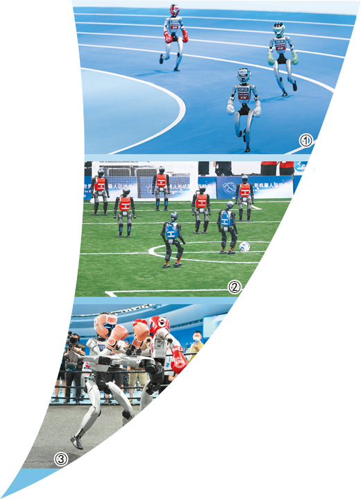 图①:在2025世界人形机器人运动会上参加比赛的人形机器人。