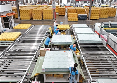 今年以来,江西省赣州市南康区积极推进消费品以旧换新活动,并采取利企惠民措施加大政策效果。图为赣州市南康区一数字化智能制造基地,工人在智能床垫生产线上赶制订单产品。朱海鹏摄(人民视觉)