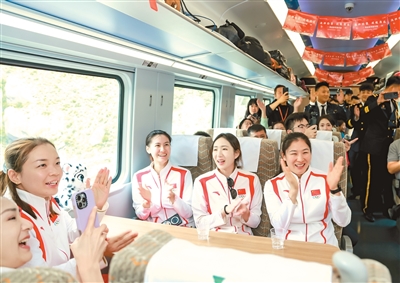 奥运冠军宣讲团在复兴号高原动车上参加交流活动。