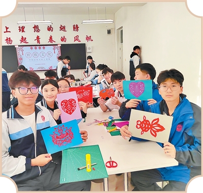 二连浩特第一中学的蒙古国学生体验中国剪纸并展示作品。
