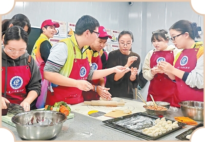 二连浩特第一中学的中蒙两国师生在包饺子。