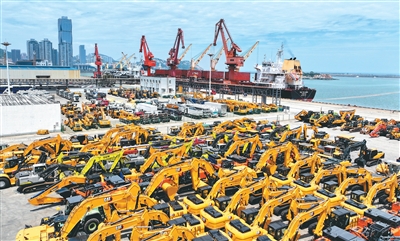 日前,在江苏省连云港港东方港务分公司码头,一艘货轮正在装载出口国外的工程机械装备。据了解,这批工程机械装备中有不少是美资企业在华设厂生产的。王 春摄(人民图片)