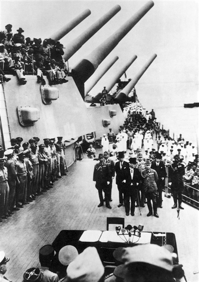 1945年8月15日,日本宣布无条件投降。9月2日,在东京湾的美国“密苏里”号战列舰上,举行日本向同盟国投降签字仪式。图为日本投降签字现场。