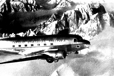 从1942年5月至1945年9月,绝大部分同盟国援华军用物资自印度汀江通过“驼峰航线”运到昆明,共向中国运输战略物资80多万吨。图为在雪峰间穿行的C—47运输机。