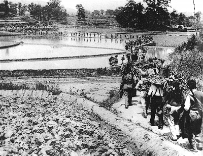 新四军挺进华中敌后,广泛发动群众,开展抗日游击战争,创建抗日根据地,开辟了广阔的华中敌后战场。图为新四军挺进敌后。