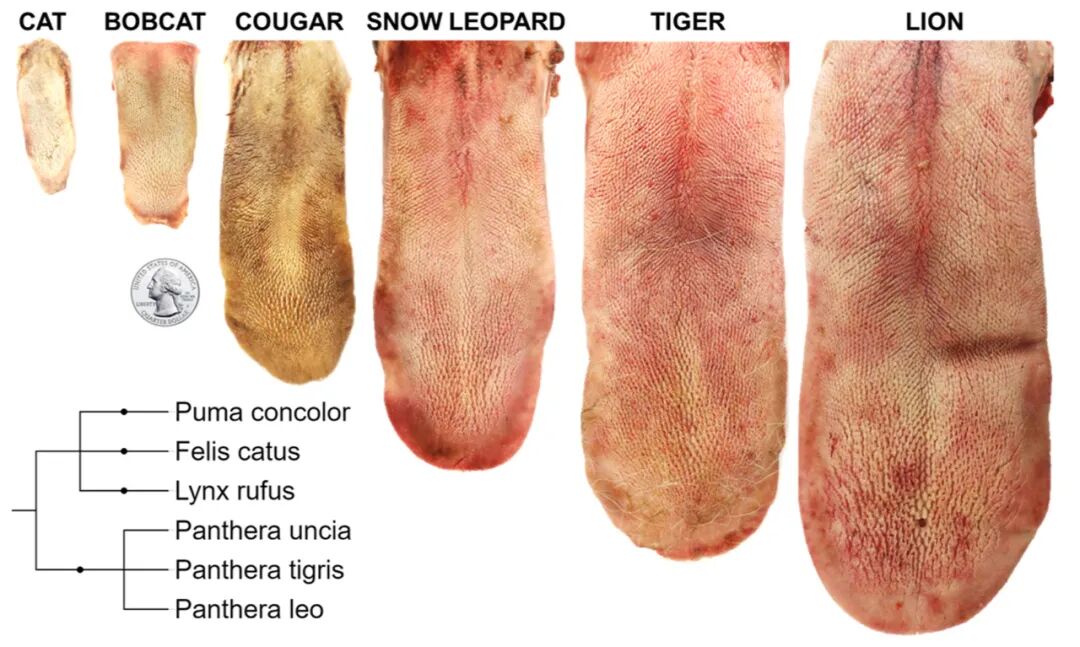 从左到右,这些舌头属于:猫、北美野猫、美洲狮、雪豹、老虎和狮子