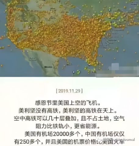 这条微博贴出一张图,显示感恩节当天美国上空飞机密密麻麻,并由此开始展示所谓“空中高铁”的种种好处。
