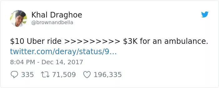 “用Uber打车去医院只需要10美元(折合约67元人民币),但叫救护车来一趟就要3000美元(折合20113元人民币)。”