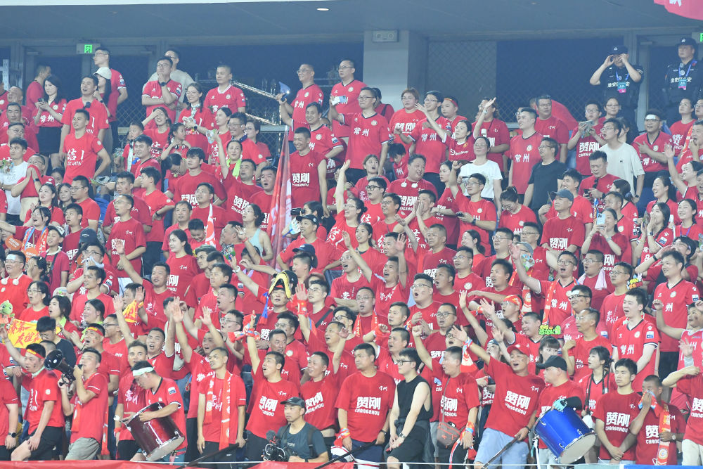 7月6日,在江苏淮安举行的2025江苏省城市足球联赛第六轮比赛中,常州队球迷为球队加油助威。新华社发(刘臻睿摄)