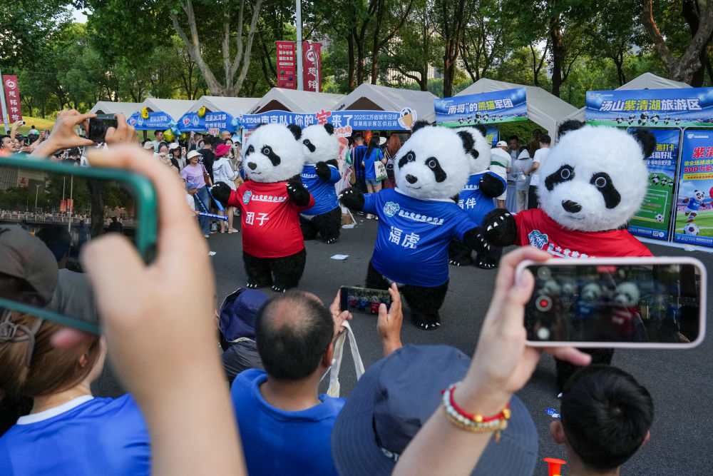 7月5日,在江苏南京举行的2025江苏省城市足球联赛第六轮比赛前,球迷在场外的文化市集观看表演。新华社记者 李博 摄
