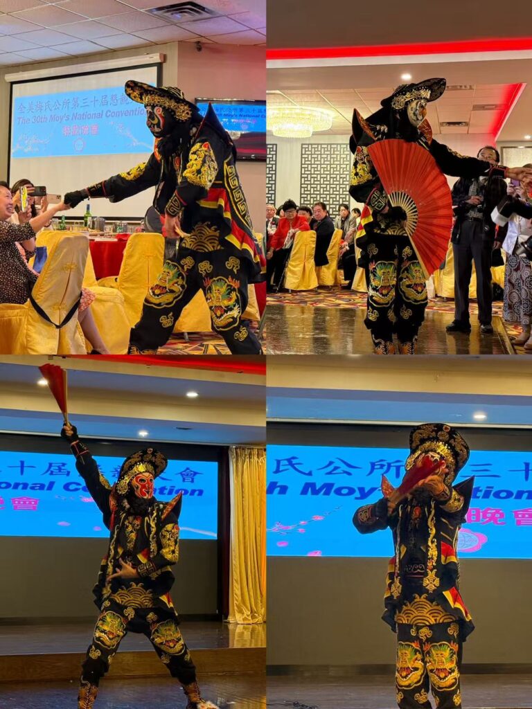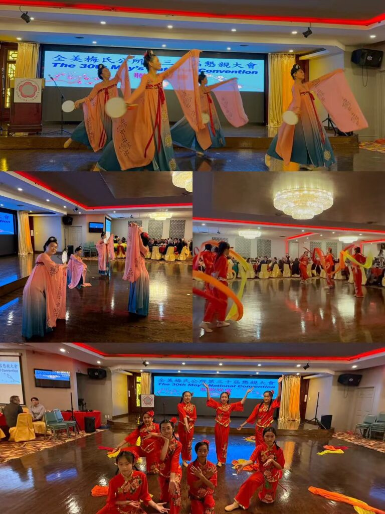 在晚宴环节,宾主欢聚,觥筹交错,文艺节目精彩纷呈。洪青体育会和广州体育会舞狮团队八只醒狮舞狮助兴。 全美梅氏公所理事會建藩理事长、仲仁理事長,芝加哥梅氏總公所浩森主席,梅施美英主席 以及所有元老,理事,理事顾问,各埠梅氏公所主席上台給舞狮紅包。