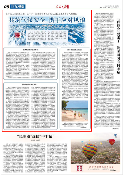 作为负责任的发展中大国,中国在积极推动自身“双碳”目标的同时,也致力于深化同太平洋岛国等发展中国家的气候变化合作。中方提出倡议,愿与岛国一道坚定维护多边主义,推动实现气候资金目标,并宣布投入资金,在清洁能源、防灾减灾、能力建设等领域,通过实施“小而美”项目、分享“风云”气象卫星数据、加强蓝色经济合作等务实举措,帮助岛国提升气候韧性。(本报记者 徐令缘)