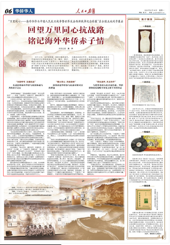 据中国华侨历史博物馆副馆长宁一介绍,本次特展是该馆开馆11年来,首次以实物形式对华侨积极参与抗日战争和世界反法西斯战争进行系统梳理和集中展示。特展通过精选的珍贵文物、文献史料和历史影像,全景式再现海外华侨在这场关乎民族存亡与世界和平的伟大斗争中的独特贡献。这些历史印记生动诠释了海外华侨与祖国母亲血脉相连、休戚与共的赤子之心。