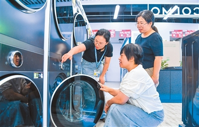 江西省宜春市将汽车、家电以旧换新等补贴申请纳入当地提振消费重点工作任务,搭建零售、百货、娱乐消费多业联盟促销平台,实现线上线下多领域消费互动。图为9月11日,消费者在宜春市袁州区凤凰街道一家商店选购洗衣机。