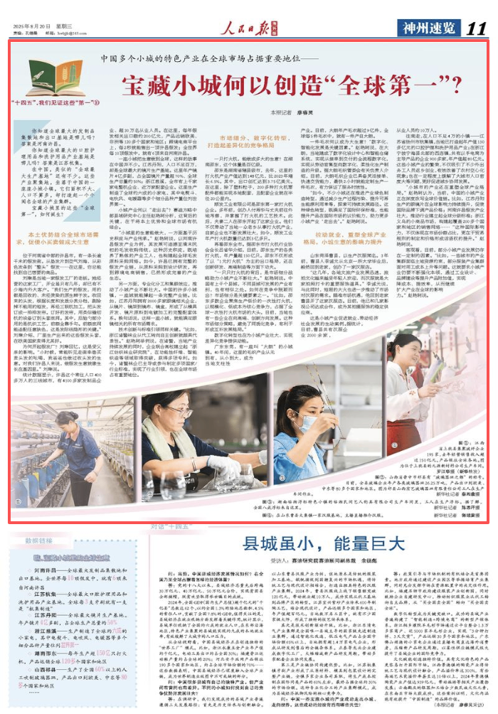 “小城市的产业还在重塑全球产业格局。”赵艳轲认为,当前,中国的小城产业正在深度改写全球价值链。比如,江苏丹阳生产的眼镜片在全球影响力持续提升,促使国际品牌下调产品价格;河南许昌假发产业壮大,推动行业建立起全球分级标准;浙江义乌的小商品市场,构建起覆盖200多个国家和地区的销售网络……“这种国际影响力,不仅体现在市场份额占比,更在于贸易规则的制定和价格形成话语权的提升。”赵艳轲说。