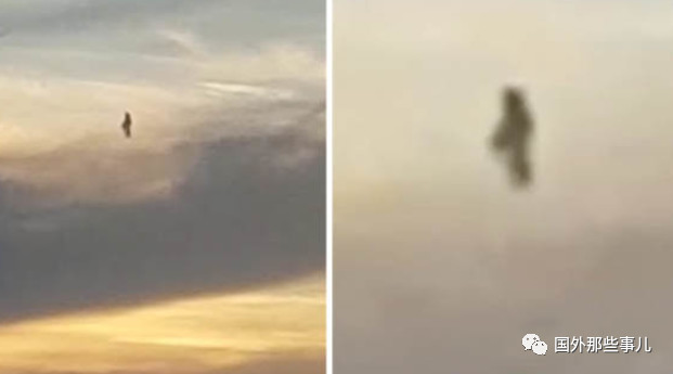 该物体在天空中保持静止,外形就像是一个人。此外,还能观察到,似乎有什么东西突出来,看起来像是武器。