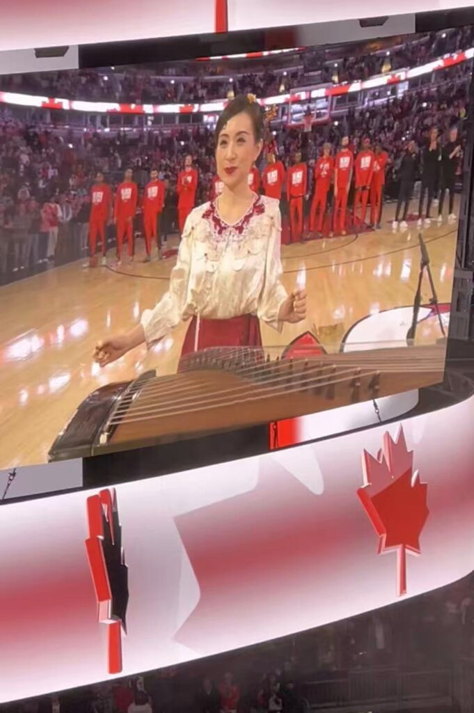 图为芝加哥华人艺术家关孟华在现场表演古筝版美国国歌《The Star-Spangled Banner》及加拿大国歌《O Canada》。以中华传统乐器演绎两国国歌,琴声悠扬、庄重典雅,东方古韵与北美精神在旋律中交汇,展现多元文化融合的独特魅力。