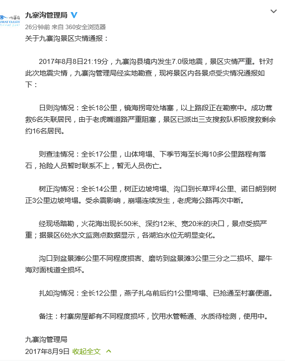 2017年8月8日21:19分,九寨沟县境内发生7.0级地震,景区灾情严重。针对此次地震灾情,九寨沟管理局经实地勘查,现将景区内各景点受灾情况通报如下: