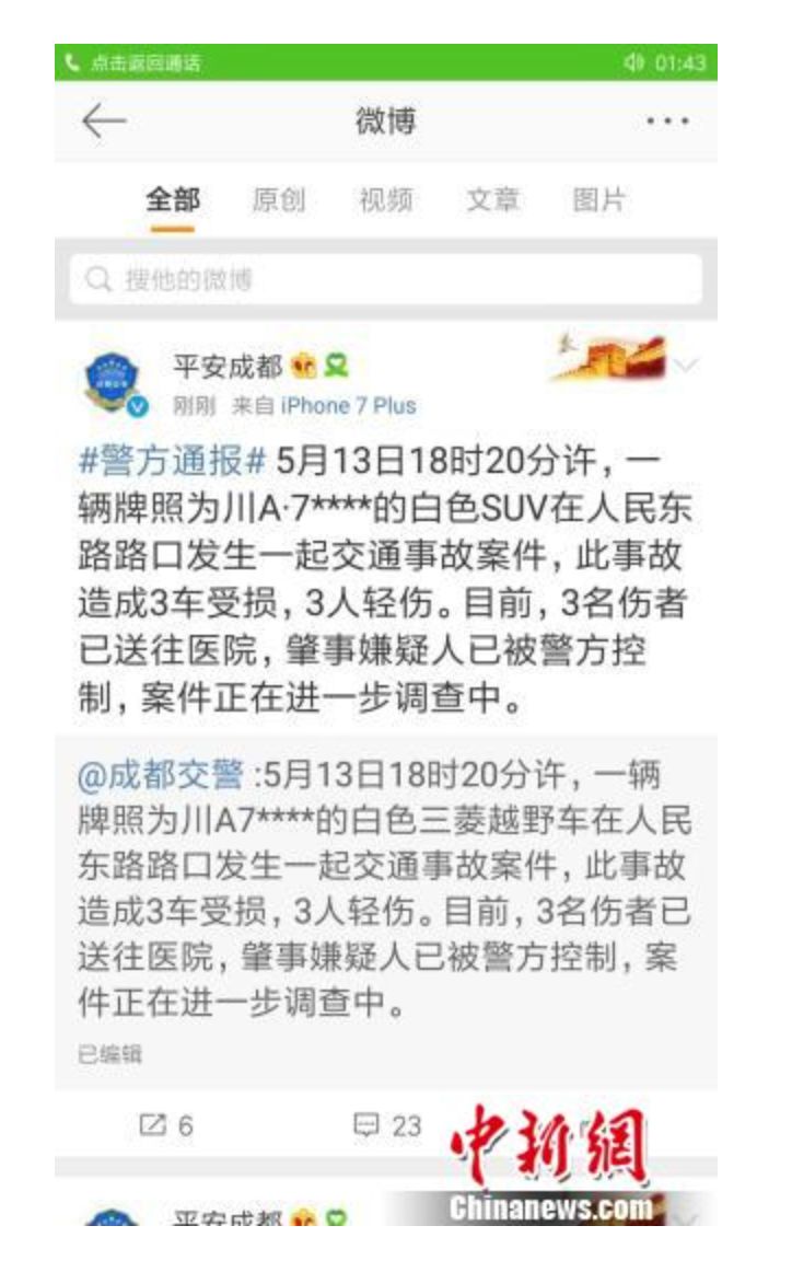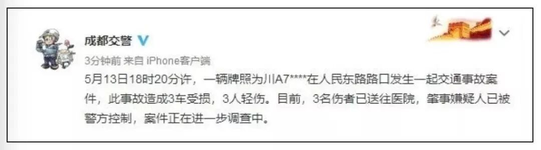 5月13日晚成都警方作出回应, 5月13日18时20分许,一辆白色三菱越野车在人民东路路口发生一起交通事故案件,此事故造成3车受损,3人轻伤。目前,3名伤者已送往医院,肇事嫌疑人已被警方控制,案件正在进一步调查中。