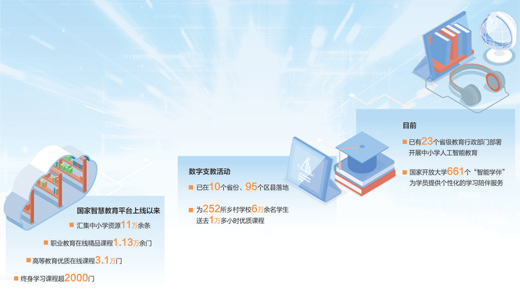 如今,平台已经汇集中小学资源11万余条,职业教育在线精品课程1.13万余门,高等教育优质在线课程3.1万门,终身学习课程超2000门。数字支教活动已在10个省份、95个区县落地,为252所乡村学校6万余名学生送去1万多小时优质课程。