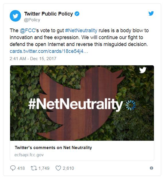 “我们赞扬阿基特·帕伊主席(FCC主席)的领导力,以及两名FCC委员为支持恢复互联网自由法令所作出的努力,我们废除了繁杂的规定,向增加投资和数码创新开启大门,回到了在过去几十年中让互联网繁荣发展的环境。今天的结果不是‘我们目前所知的互联网的重点’,而是引导我们进入一个有利于消费者的宽松规则新时代。”