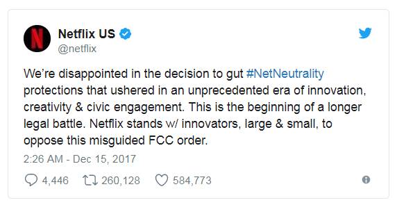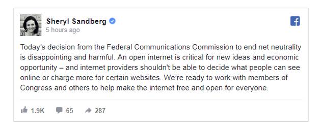 FCC此项决定引起了包括美国网络视频点播巨头Netflix等多家互联网科技公司在社交媒体的公开反对。Facebook首席运营官谢丽尔·桑德伯格(Sheryl Sandberg)表示,这个决定“令人失望,将带来危害”。