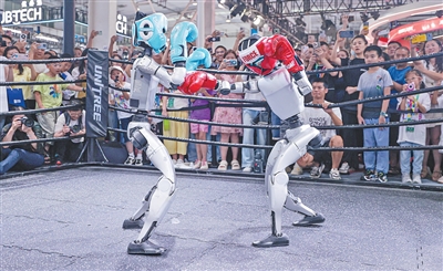 连续施展侧踢、勾拳、组合拳等动作,被击倒后会迅速爬起继续战斗……在宇树科技展区,一场机器人格斗赛正在进行。“参赛选手是我们最新升级的G1格斗款人形机器人,拥有先进的动态平衡算法,在外部冲击下实时调动各个关节电机,站得更稳、起身更快。”宇树科技市场部经理廉莹莹说。