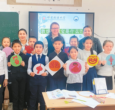 奥莉娅(后排中)在乌兹别克斯坦塔什干州的一所中学内授课,向外国青年讲述敦煌文化。