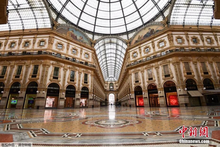 资料图:意大利米兰市中心空无一人的维托里奥·埃马努埃莱二世购物中心。
