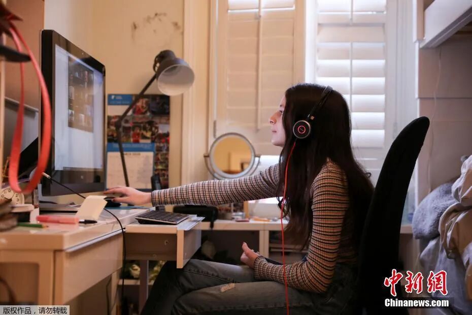 美国纽约州的学生在家中进行线上学习。图片来源:中国新闻网