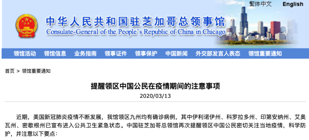 中国驻芝加哥总领馆网站截图。