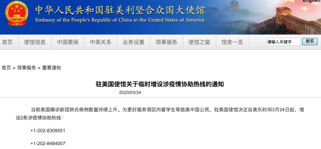 中国驻美国大使馆已经特别开放了两条涉疫情协助热线,方便旅美中国公民和留学生咨询;