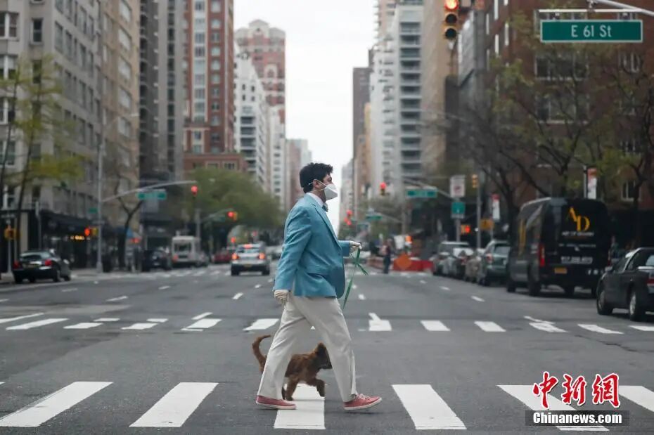 当地时间4月12日,西方传统节日复活节,纽约曼哈顿一位男士身着西服遛狗。(中新社记者 廖攀 摄)