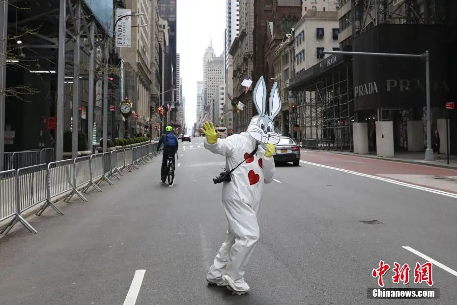 当地时间4月12日,西方传统节日复活节,一位市民身穿防护服、头戴防护面罩在纽约曼哈顿第五大道装扮成复活节兔。(中新社记者 廖攀 摄)