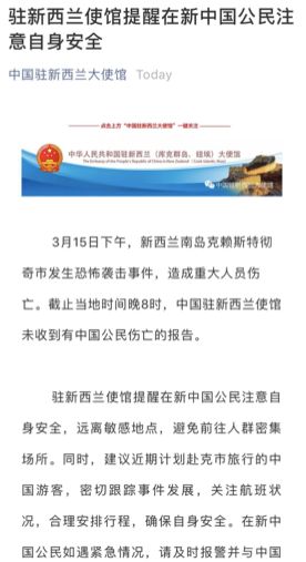 中国驻新大使馆提醒中国公民注意安全
