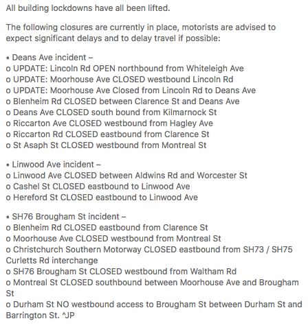 警方仍将此事件视为持续进行,并强烈要求基督城居民留在室内并保持安全。