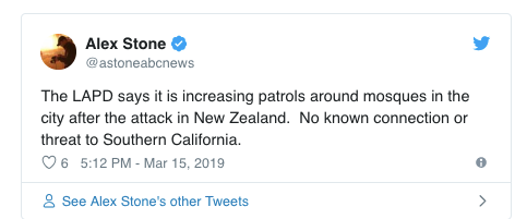 新西兰事件发生后,美国警察正在加强对清真寺周围的巡逻。