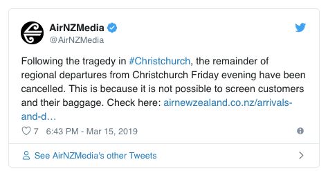 由于无法筛选客户及其行李,新西兰航空公司已发布推文:基督城始发的航班已被取消。
