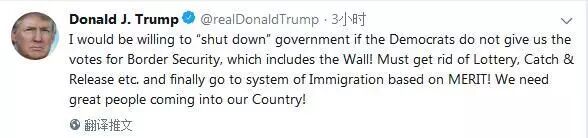特朗普在推文中说,如果民主党不为我们包括边境墙在内的边境安全投票,那我愿意关闭政府。我们必须取消彩票(签证抽奖)、抓捕和释放等,并最终使移民系统取决于功绩。我们需要伟大的人来到我们国家!