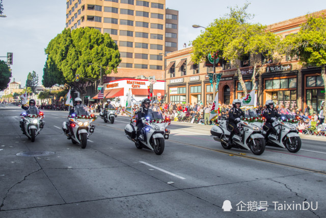美国当地时间2018年1月1日,洛杉矶帕萨迪纳举行了“第129届玫瑰花车大游行”,来自世界各地的游客及当地的民众上百万人观看了这一年度盛事。来自洛杉矶警局的摩托车队首当其冲,为这一盛事拉开了序幕。