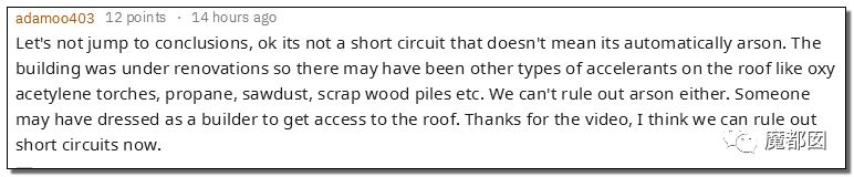 “让我们不要妄下结论,好吧,这不是一个短路,该建筑正在装修,因此屋顶上可能还有其他类型的促进剂,如氧乙炔,丙烷,锯末,废木桩等。我们也不能排除纵火。有人可能穿着打扮成建筑工人进入屋顶。感谢视频,我想我们现在可以排除短路了。”