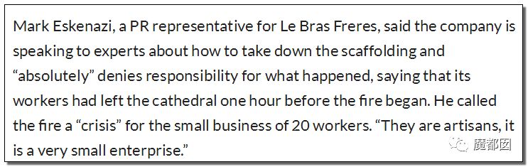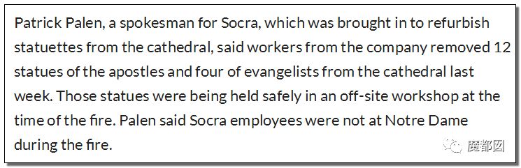 而雕像翻新公司的代表也全面否定,说我们那天根本没有在修复工作,所有的雕像都拿到了车间以外,根本没有员工在巴黎圣母院,怎么可能是我们引发火灾?