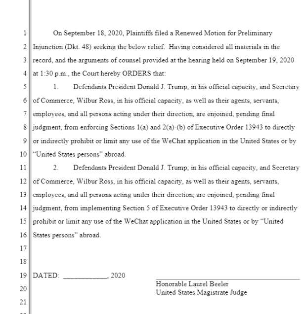 最终,法官Laurel Beeler要求原告方起草建议判决(proposed order),其中提及禁止令,这意味着,在微信禁令20日晚上11时59分生效前,法官将要发布禁止令。